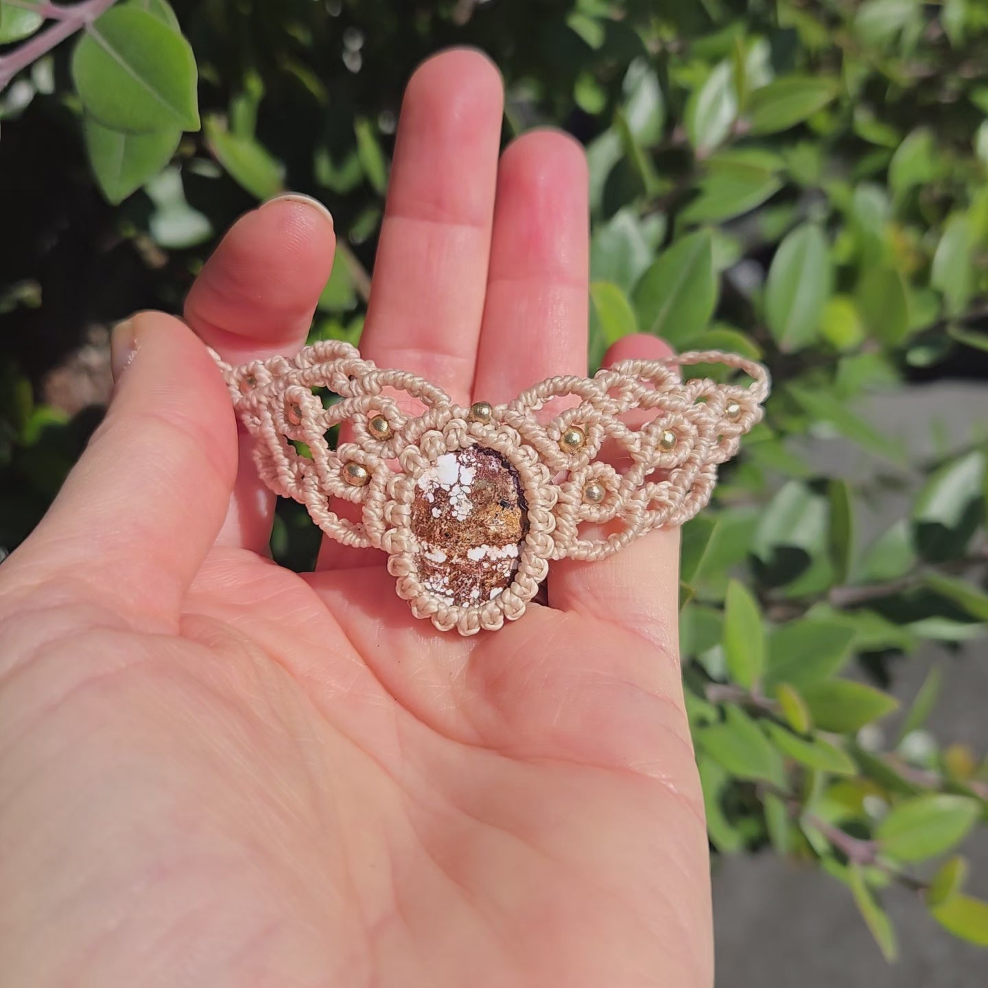 An elegant choker-style micro macramé necklace centred around an oval Wild Horse Jasper stone in earthy brown and white hues. Brass beads form a graceful pattern along natural-toned thread, creating a versatile piece for any occasion. Wear Grounded in Grace as a reminder that you are enough, because you live in God's unmerited favour.